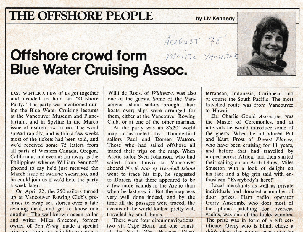 Liv Kennedy, who wrote the Offshore People column for Pacific Yachting magazine for many years, starting in 1970, also started a speakers’ series on blue water cruising for the Vancouver Maritime Museum. The Blue Water Cruising in Small Boats speakers’ series had its debut in 1976, and went on to become a very popular event, boasting full houses on a regular basis. It was during one of those presentations in 1978 that Liv circulated a paper clipboard inviting those interested in forming a blue water sailing club to sign up and come to an “Offshore Party” in April. Seventy-nine people signed up, and many of those became the founding members of what is now a thriving association of just under 500 members, staying true to its vision of “fostering seamanship and friendship for people with an active interest in offshore cruising”.