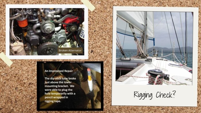 Norm Cooper detailed an event in another Currents piece: during a stormy 325 NM passage from Niue to Tonga, the alternator failed to charge the 800 Ah battery bank. They adapted by first shutting down refrigeration and other non-essentials to conserve power, then had the time to troubleshoot a corroded spade connector and crimp a new one on to restore the system. (“Lessons Learned the Hard Way – Electrical Failure”, August 2016).