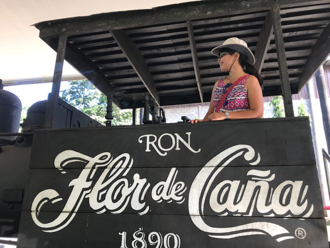 Debra getting in the spirit for our Flor de Caña rum tour.