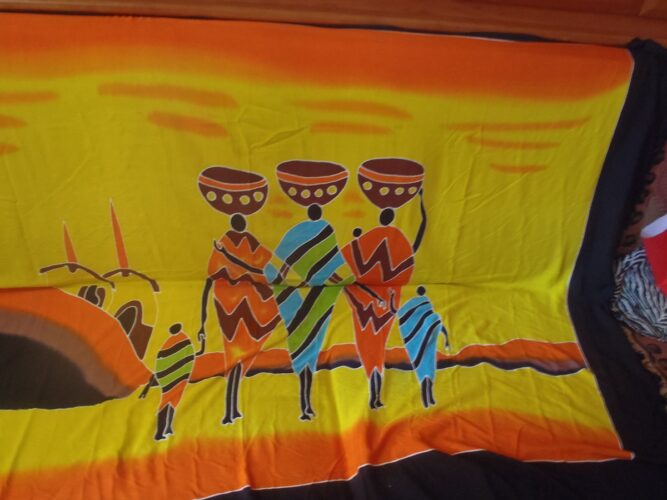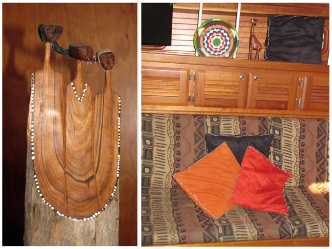 We loved the Tahaitian Look, but the shiny cotton started to wear badly, especially on corners. When we reached South Africa, I contacted an upholsterer with the hope of getting beautiful leather upholstery. She promised, but then broke her promise when the World ARC came in with customers paying three times the set price. I was quite discouraged, but when we went shopping I discovered a bonanza of wonderful African prints. I paid $140 CDN for material, zippers, thread and everything necessary to turn our salon into a masterpiece in stripes. We bought beautiful original art including the Three Graces carved from a single tree trunk and African prints for Duvet covers.