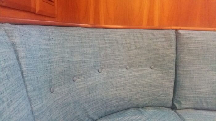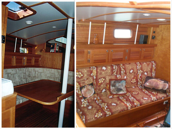 I found I got tired of having the same salon furniture year in and year out. Traversay III’s original upholstery was serviceable and sand-coloured but not very exciting. After a few years and lots of sailing, this became a dirty beige. Unfortunately, a dry-cleaning attempt in Chile shrank the upholstery, giving it an unattractive bulging look. We lived with it until we got to Tahiti where I bought a great deal of beautiful Tahitian cotton. I made new covers, and I used T-shirt transfers to make attractive pillow covers using some of the underwater photos we’d taken. The Tahitian Look was my first foray into salon re-decoration.