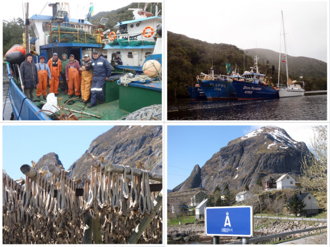 Top Left: Larry aboard the Don Nestor; Top Right: Rafted to fishboats in Caleta, Suarez Chile; Bottom Right: Codfish drying in Moskenesoy Norway; Bottom Left: A town in Norway with a very short name!
