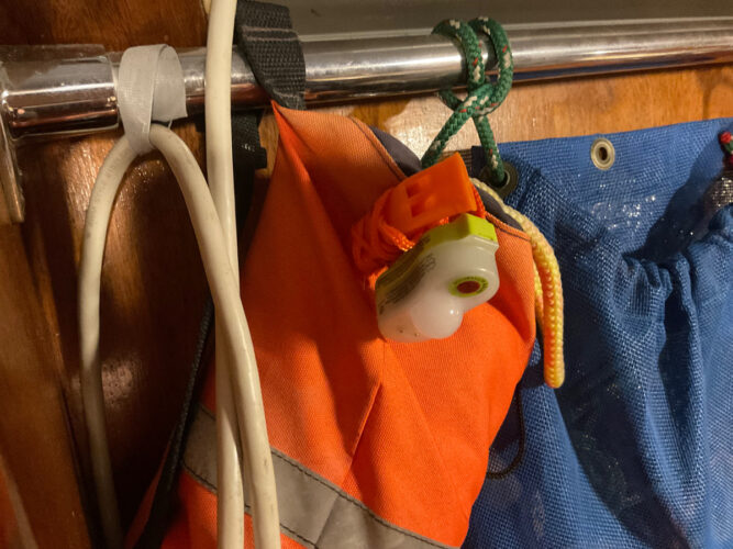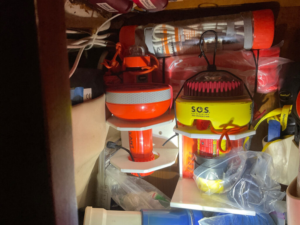 • For eFlares, store them in some form of clearly labelled case, bag, or mount so they will not get damaged rolling around, cannot accidentally activate, and won’t shift out of place in rough seas and be hard to find when you need them. Most eFlares come with a distress flag as a daytime signalling device: the ties for the four corners of the flag are often woefully short and usually not attached to the flag as shipped, so obtain and attach appropriate tie-downs before you stow it (you don’t want to be looking for bits of string to secure it if you need to deploy it in a hurry). The flags themselves are often flimsy, so consider adding a spare or two.