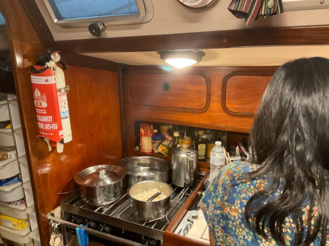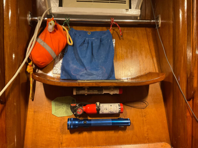 Avant’s companionway, with a heaving line, white collision avoidance flare, small fire extinguisher, and flashlight, all instantly visible and available.