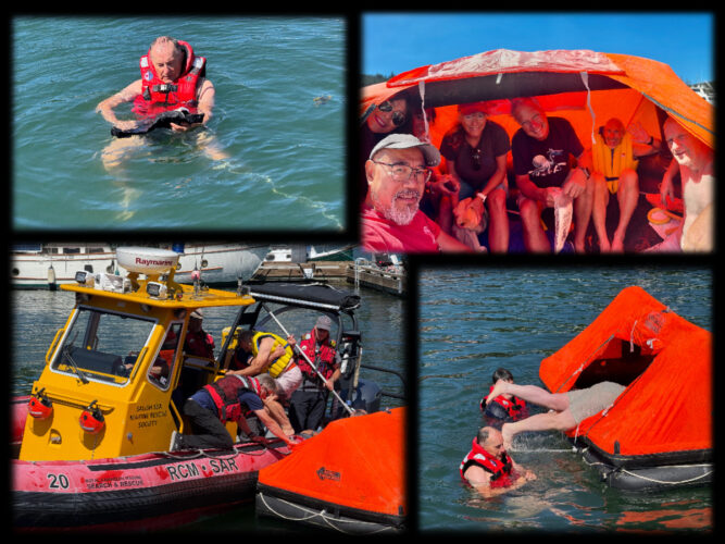 Of course, it was convenient to head over to the life raft demonstration aboard Arahura. A life raft is yet another Plan B, one that you hope you don’t need. And if you do, you hope it works. I was surprised by the intrepid volunteers who braved the cool waters and had trouble getting over the life raft tubes. The attached rope, which hangs in the water to help with boarding, would just force their feet under the raft. It was better to use it after their body was over the tube. It was a relief to finally climb inside the raft, pump the floor, and discover its accoutrements: food rations, patch kit, oars, a sponge, even an instruction manual. To add to the realism, the local Coast Guard Auxiliary participated in the “rescue”.