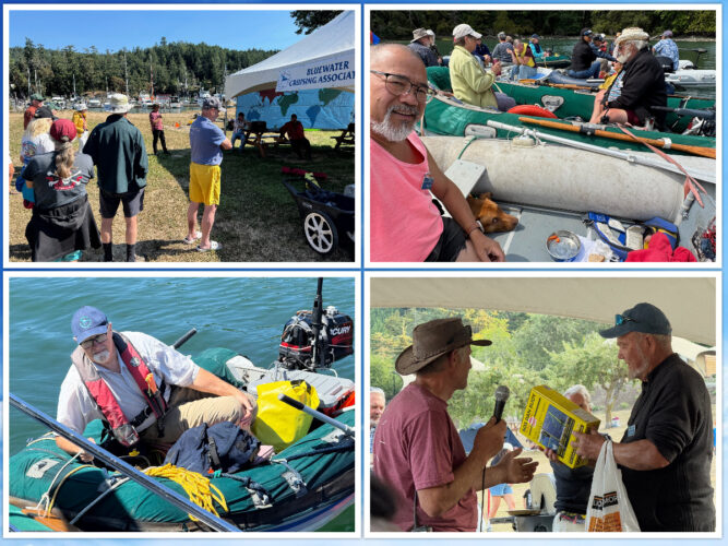 Top left: World cruising map in the background with cruising routes from earlier BCA members; Top right: The lunchtime dinghy raft up with Roger and his dog Lu-Bu (named for the Chinese warrior, Lü Bu); Bottom left: BCA Commodore David Vincent; Bottom right: Door prizes being given out, thanks to generous sponsors.