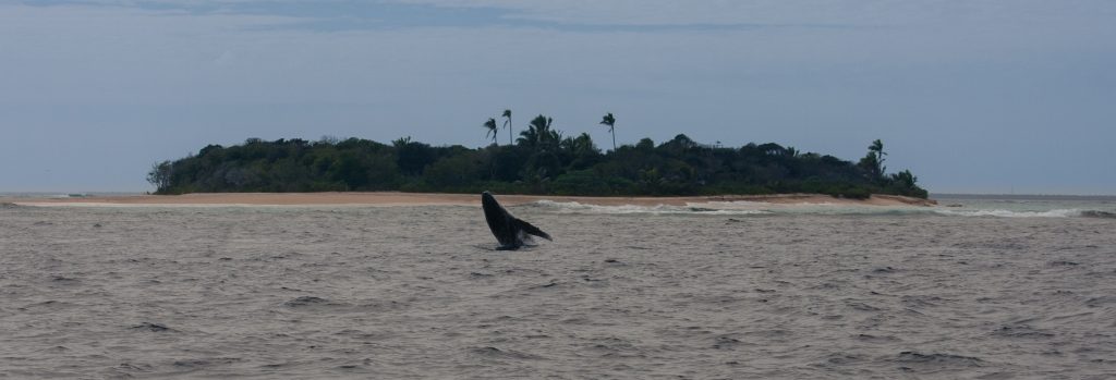 We took advantage of a few days of quiet wind to anchor at the tiny island of Hakauata, which seems to be a kindergarten for humpbacks. A common sight is to watch a large female whale demonstrate spy-hopping and fin slapping as a small whale practices. The larger whales are not afraid and the young whales are curious. We had one young whale swim over to inspect the dinghy we were towing. It is also common to be woken by the gentle blows (breathing) and songs of the whales.