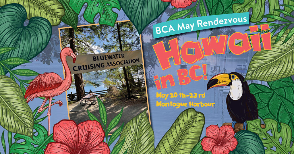 Aloha! Please join your fellow BCA members at Montague Harbour for the annual May Rendezvous hosted by the Vancouver Island Chapter on the Victoria Day weekend (May 20-23). Arrive Friday evening or anytime Saturday before Happy Hour, when we get off to our official start at 4.00pm.