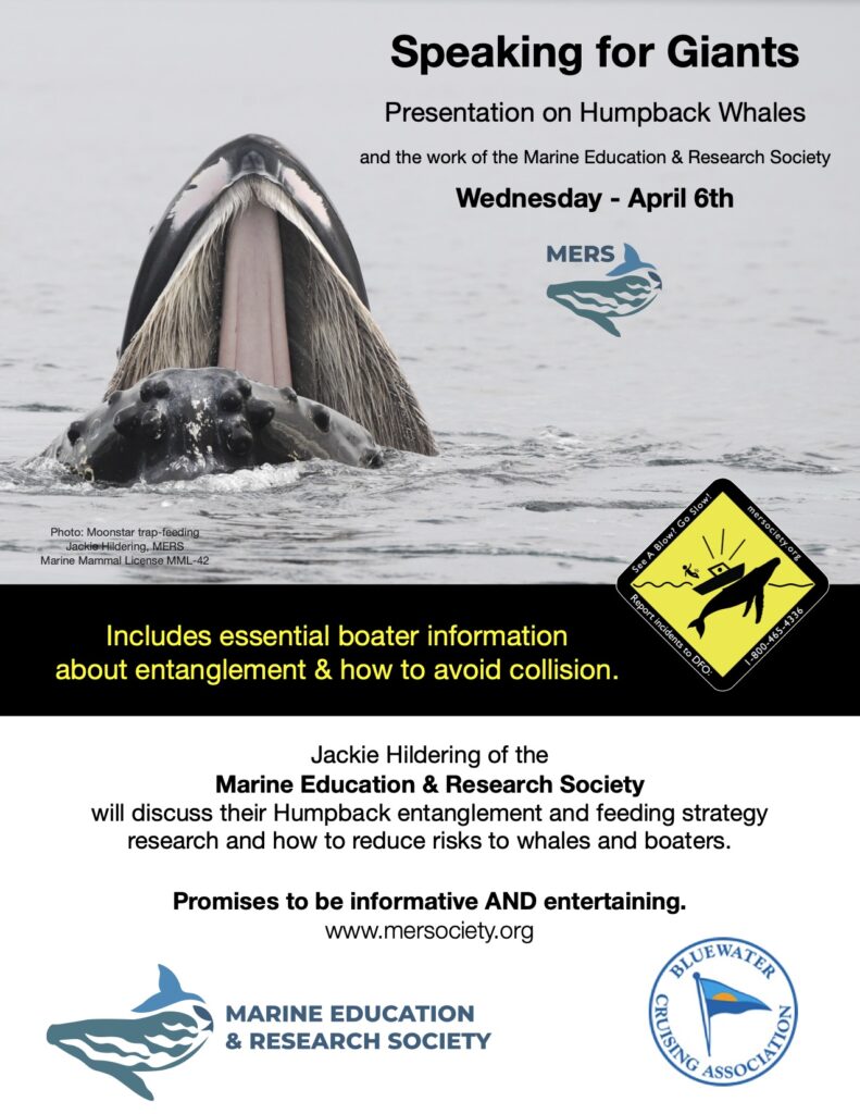 On April 6th, we’ll be immersed in knowledge about Humpback Whales and how the fortuitous increase in the number of these giants off our coast is a game changer for boaters. Presenter is Jackie Hildering is a researcher with the Marine Education and Research Society (MERS). MERS is based on NE Vancouver Island with education efforts being coast-wide.